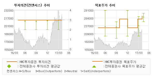 | 의견제시일자 | 증권사 | 투자의견 | 목표가 | | 20170426 | HMC투자증권 | 매수 | 270,000 | | 20170413 | 흥국증권 | 매수(유지) | 260,000 | | 20170412 | IBK투자증권 | 매수 | 250,000 | | 20170411 | SK증권 | 매수(유지) | 280,000 |