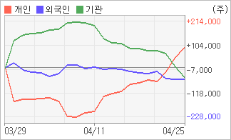 | 외국인과 기관은 순매도, 개인은 순매수(한달누적) 4월10일부터 기관이 12거래일 연속 순매도 행진을 벌이고 있다. 4주간을 기준으로 보면 외국인이 매도 우위를 지속하면서 50,165주를 순매도했고, 기관도 순매수에서 순매도로 반전되면서 42,070주를 순매도했지만, 개인은 오히려 매수반전의 모습을 보이며 92,235주를 순매수했다. |