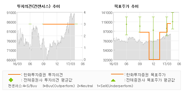 | 의견제시일자 | 증권사 | 투자의견 | 목표가 | | 20170426 | 한화투자증권 | 매수(유지) | 115,000 | | 20170426 | 하나금융투자 | 매수 | 130,000 | | 20170421 | 동부증권 | 매수 | 110,000 | | 20170418 | HMC투자증권 | 매수 | 102,000 | |
