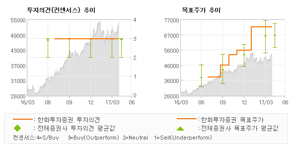 | 의견제시일자 | 증권사 | 투자의견 | 목표가 | | 20170426 | BNK투자증권 | 매수(유지) | 60,000 | | 20170426 | 골든브릿지투자증권 | 매수(유지) | 65,000 | | 20170426 | 흥국증권 | 매수(유지) | 64,000 | | 20170426 | 한화투자증권 | 매수(유지) | 72,000 |