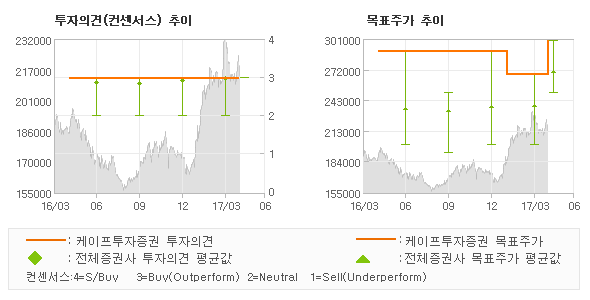 | 의견제시일자 | 증권사 | 투자의견 | 목표가 | | 20170426 | 케이프투자증권 | 매수(유지) | 300,000 | | 20170426 | 신한금융투자 | 매수(유지) | 250,000 | | 20170426 | IBK투자증권 | 매수(유지) | 270,000 | | 20170426 | HMC투자증권 | 매수 | 270,000 |