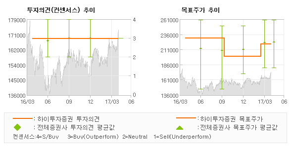 | 의견제시일자 | 증권사 | 투자의견 | 목표가 | | 20170426 | 하이투자증권 | 매수(유지) | 220,000 | | 20170426 | 키움증권 | 매수(유지) | 240,000 | | 20170426 | 동부증권 | 매수(유지) | 220,000 | | 20170426 | NH투자증권 | 매수(유지) | 230,000 |