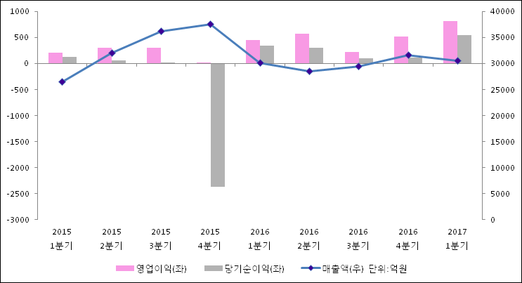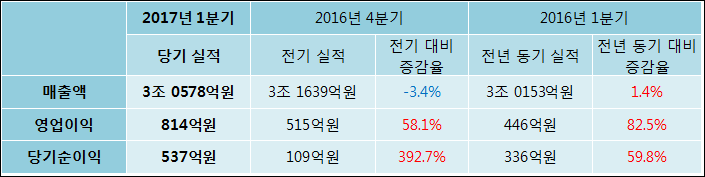 04월 26일 LG상사(001120)의 2017년 1분기 연결 잠정 실적이 발표됐다. 매출액, 영업이익, 당기순이익 모두 지난해 같은 기간 대비 상승하였다. 매출액은 1.4%, 상승한 3조 0578억원으로 발표되었다. 영업이익과 당기순이익은 각각 82.5%, 59.8% 증가하여 814억원, 537억원으로 기록 되었다.