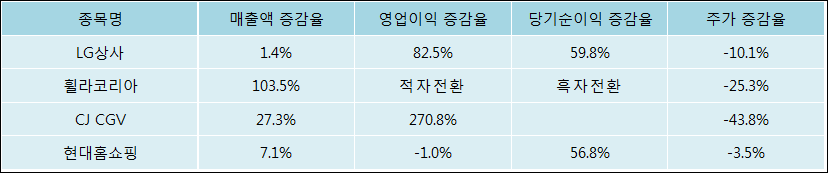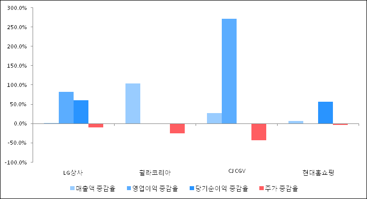 다음은 LG상사와 동일 업종 내 비교 그룹 종목의 각각 최근 실적의 전년 동기 대비 성장률이다. LG상사의 매출액은 증가했지만 증감율은 타 종목 대비 저조한 편이다. 그리고 주가는 하락하였지만 가장 나은 상승률을 기록하였다.
