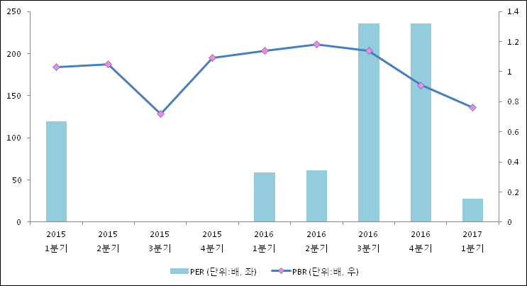 주가가 1주당 수익의 몇배가 되는지 나타내는 주가수익비율(PER)은 27.31배로 나타났다. 이는 최근 일년과 비교했을 때 급락한 수치이다. 1분기 EPS는 상승하고 주가가 하락하였기 때문이다. 전년 동기 PER은 58.69배로 이번 분기에 하락했다.주가가 1주당 순자산의 몇배인지 알려주는 주가순자산비율인 PBR은 0.76배이다. PBR은 최근 3분기 이상 연속으로 하락하고 있다. 지난해 동기 PBR은 1.14배로 이번 1분기 PBR이 하락했다.