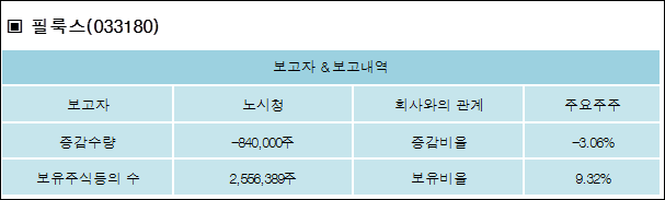 필룩스(033180)는 26일 주요주주 노시청의 보유주식이 감소되었다고 발표했다. 이는 직전 보고일보다 840,000주 감소하여 지분율은 9.32%로 하락했다. 이번 보고 사유는 장외매도따른보유주식수감소로 알려졌다.