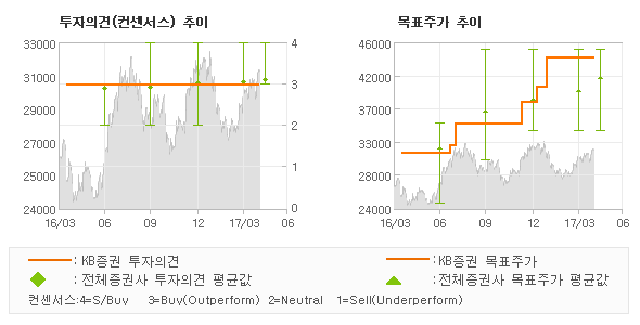 | 의견제시일자 | 증권사 | 투자의견 | 목표가 | | 20170427 | KB증권 | BUY(유지) | 44,000 | | 20170425 | 신한금융투자 | 매수(유지) | 40,000 | | 20170419 | 삼성증권 | 매수 | 38,000 | | 20170418 | 한화투자증권 | 매수(유지) | 41,000 |