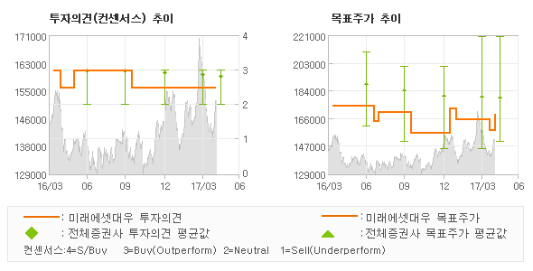 | 의견제시일자 | 증권사 | 투자의견 | 목표가 | | 20170427 | 미래에셋대우 | TRADING BUY(유지) | 168,000 | | 20170427 | KB증권 | 매수(유지) | 185,000 | | 20170419 | 키움증권 | 매수(유지) | 170,000 | | 20170412 | SK증권 | 매수(유지) | 175,000 |