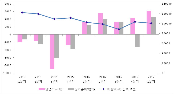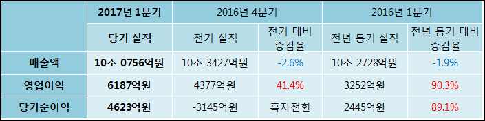 04월 27일 현대중공업(009540)의 2017년 1분기 연결 잠정 실적이 발표됐다. 작년 같은 기간 대비해서 매출액은 10조 0756억원으로 1.9% 하락하였다. 그럼에도 영업이익은 90.3% 증가하여 6187억원으로 발표됐다. 당기순이익 역시 4623억원으로 89.1% 상승하였다.