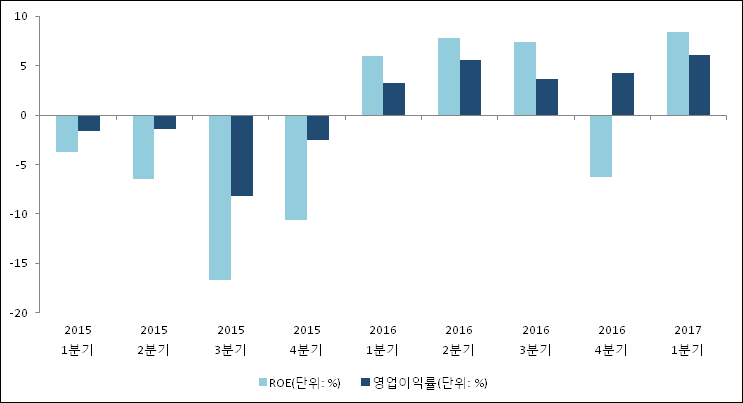이번분기 기준으로 추정되는 현대중공업의 자기자본이익률(ROE)은 8.4%로 나타났다. 전년 동기인 2016년 1분기 ROE는 6%로 이번 분기에 2.4%p 상승했다. 한편 동종목의영업이익률은 6.1%이다. 지난해 동기 영업이익률은 3.2%로 이번 1분기가 2.9%p 상승했다.