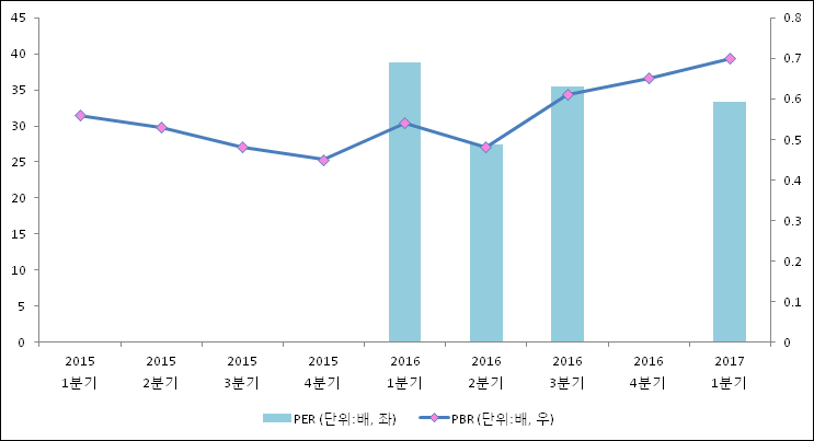 주가가 1주당 수익의 몇배가 되는지 나타내는 주가수익비율(PER)은 33.36배로 나타났다. 전년 동기 PER은 38.81배로 이번 분기에 하락했다.주가가 1주당 순자산의 몇배인지 알려주는 주가순자산비율인 PBR은 0.7배이다. PBR은 최근 3분기 이상 꾸준히 상승하고 있다. 지난해 동기 PBR은 0.54배로 이번 1분기 PBR이 상승했다.