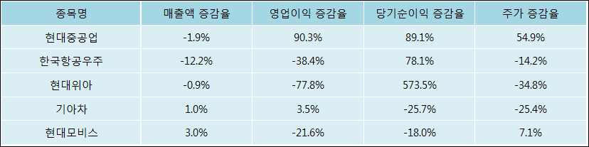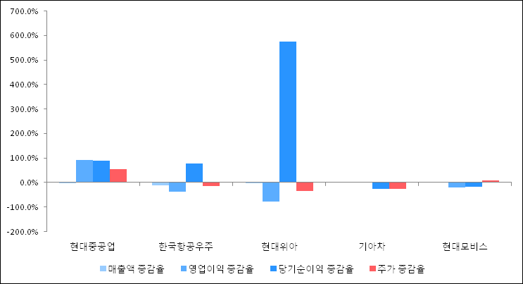 다음은 현대중공업과 동일 업종 내 비교 그룹 종목의 각각 최근 실적의 전년 동기 대비 성장률이다. 현대중공업의 매출액 증감율은 타 종목 대비 저조한 편이다. 그리고 주가는 가장 높은 상승률을 보였다.