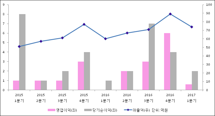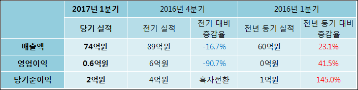 04월 27일 영인프런티어(036180)의 2017년 1분기 개별 잠정 실적이 발표됐다. 전년 같은 기간 대비해서 매출액, 영업이익, 당기순이익 모두 증가하였다. 60억원이었던 매출액은 23.1% 증가하여 74억원을 기록했다. 영업이익은 41.5% 상승하여 0.6억원이고, 당기순이익은 2억원으로 발표됐다.