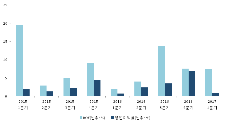 이번분기 기준으로 추정되는 영인프런티어의 자기자본이익률(ROE)은 7.4%로 나타났다. 전년 동기인 2016년 1분기 ROE는 1.9%로 이번 분기에 5.5%p 상승했다. 한편 동종목의영업이익률은 0.8%이다. 최근 3분기 이상 꾸준히 상승하다가 이번 분기에 하락했다. 지난해 동기 영업이익률은 0.7%로 이번 1분기가 0.1%p 상승했다.
