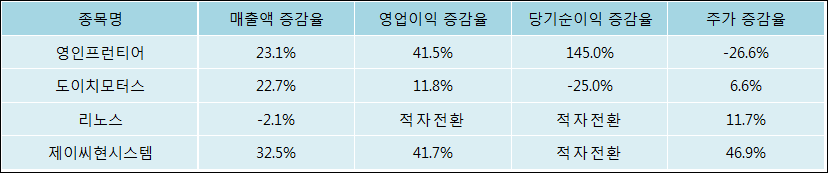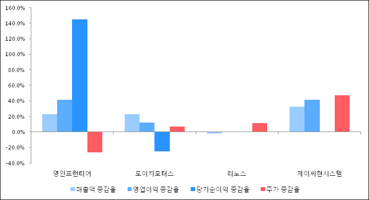 다음은 영인프런티어와 동일 업종 내 비교 그룹 종목의 각각 최근 실적의 전년 동기 대비 성장률이다. 영인프런티어의 매출액 증감율은 타 종목 대비 가장 우수한 편이다. 그리고 주가의 하락율이 가장 큰 편으로 나타났다.