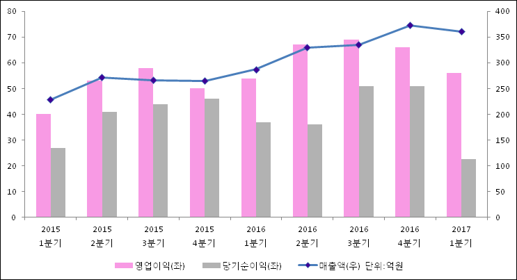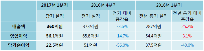04월 27일 아이센스(099190)의 2017년 1분기 연결 잠정 실적이 발표됐다. 매출액 360억원으로, 영업이익은 56.1억원으로 전년 동기 대비 각각 25.2%, 3.1% 증가했다. 반면 당기순이익은 22.5억원으로 40% 하락했다.
