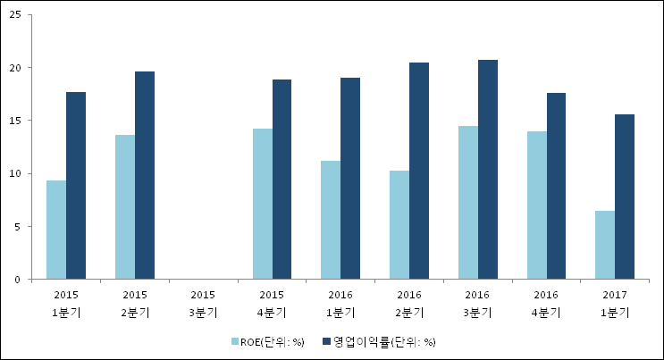 이번분기 기준으로 추정되는 아이센스의 자기자본이익률(ROE)은 6.5%로 나타났다. 전년 동기인 2016년 1분기 ROE는 11.2%로 이번 분기에 4.7%p 하락했다. 한편 동종목의영업이익률은 15.6%이다. 4분기 이상 상승하다가 저번 분기부터 이번분기까지 하락세로 돌아섰다. 지난해 동기 영업이익률은 19%로 이번 1분기에 3.4%p 하락했다.