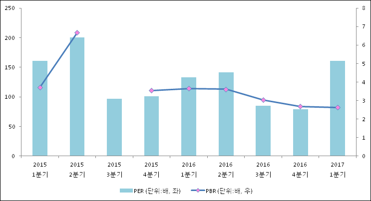 주가가 1주당 수익의 몇배가 되는지 나타내는 주가수익비율(PER)은 161.02배로 나타났다. 전년 동기 PER은 132.6배로 이번 분기에 상승했다.주가가 1주당 순자산의 몇배인지 알려주는 주가순자산비율인 PBR은 2.62배이다. PBR은 최근 4분기 이상 연속으로 하락하고 있다. 지난해 동기 PBR은 3.65배로 이번 1분기 PBR이 하락했다.