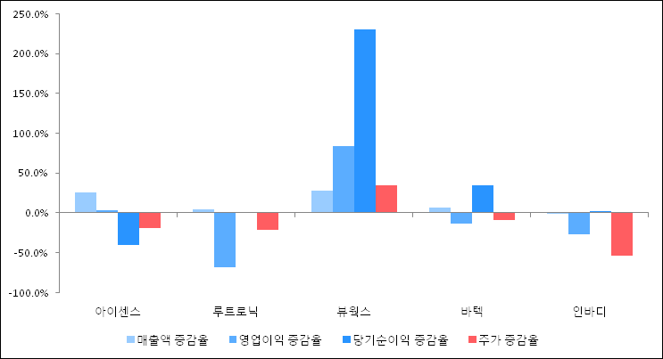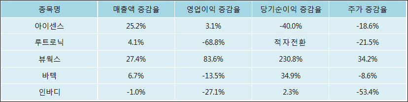 다음은 아이센스와 동일 업종 내 비교 그룹 종목의 각각 최근 실적의 전년 동기 대비 성장률이다. 아이센스의 매출액 증감율은 타 종목 대비 우수한 편이다. 그리고 주가는 하락하였지만 하락율이 비교적 크지는 않았다.