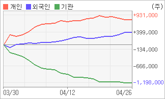 | 외국인/개인 순매수, 기관은 순매도(한달누적) 기관이 4일연속 주식을 팔고 있는 반면 외국인은 3일연속 주식을 사고 있다. 4주간을 기준으로 보면 외국인이 초반에 동종목을 순매수한 이후에 기세를 이어가며 403,546주를 순매수했고, 개인들도 순매수량을 늘리며 793,650주를 순매수했다. 하지만 기관은 매도 관점으로 접근하면서 1,197,196주를 순매도했다. |