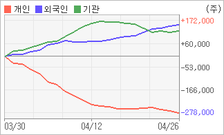 | 외국인/기관 순매수, 개인은 순매도(한달누적) 4월14일부터 외국인들이 9거래일 연속 순매수 행진을 벌이고 있다. 4주간을 기준으로 보면 외국인이 초반에 동종목을 순매수한 이후에 기세를 이어가며 153,444주를 순매수했고, 기관도 초반에 동종목을 순매수한 이후에 최근에는 순매수량이 줄어들고 있음에도 불구하고 123,893주를 순매수했다. 반면 개인들은 매도쪽으로 방향을 잡으면서 277,337주를 순매도한 것으로 나타났다. |