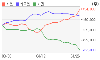 | 외국인/개인 순매수, 기관은 순매도(한달누적) 4월24일부터 전일까지 기관과 외국인은 3거래일연속 동반 순매도했다. 4주간을 기준으로 보면 외국인이 매수 우위를 유지하면서 268,627주를 순매수했고, 개인들도 매수반전의 모습을 보이며 453,919주를 순매수했다. 하지만 기관은 매도 관점으로 접근하면서 722,546주를 순매도했다. |