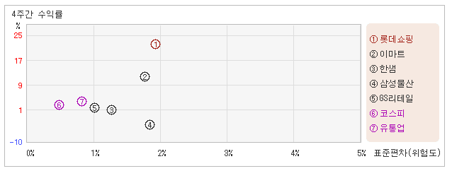 | 관련종목들 가운데서 변동폭은 낮지만 수익률은 커 27일 오후 2시10분 현재 전일대비 4.52% 오른 266,000원을 기록하고 있는 롯데쇼핑은 지난 1개월간 22.3% 상승했다. 동기간 동안에 주가움직임의 위험지표인 표준편차는 1.9%를 기록했다. 이는 유통업 업종내에서 주요종목들과 비교해볼 때 롯데쇼핑의 월간 주가수익률이 가장 높았던 만큼 변동성도 가장 높은 수준을 유지했다는 뜻이다. 최근 1개월을 기준으로 롯데쇼핑의 위험을 고려한 수익률은 11.7을 기록했는데, 변동성이 가장 컸으나 주가상승률도 매우 높았기때문에 위험대비 수익률도 높은 수준을 나타냈다. 뿐만아니라 유통업업종의 위험대비수익률인 3.5보다도 높기 때문에 업종대비 성과도 좋았다고 할 수 있다. 다음으로 업종과 시장을 비교해보면 롯데쇼핑이 속해 있는 유통업업종은 코스피지수보다 변동성과 수익률이 모두 높은 모습이다. 다시 말하면 동업종에 탄력이 붙으면서 지수대비 초과상승했다는 의미이다. |