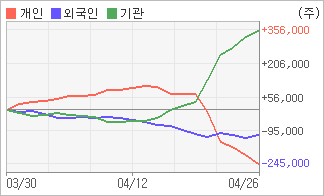 | 외국인과 개인은 순매도, 기관은 순매수(한달누적) 4월11일부터 기관이 12거래일 연속 순매수 행진을 벌이고 있다. 4주간을 기준으로 보면 기관이 순매도를 기록하다가 다시 순매수로 돌아서면서 355,464주를 순매수한 반면, 외국인은 매도 우위를 지속하면서 110,495주를 순매도했고, 개인들도 매도 우위로 반전되면서 244,969주를 순매도했다. |