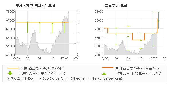 | 의견제시일자 | 증권사 | 투자의견 | 목표가 | | 20170427 | 신한금융투자 | 매수(유지) | 85,000 | | 20170427 | 이베스트투자증권 | 매수(유지) | 87,000 | | 20170427 | IBK투자증권 | 매수(유지) | 80,000 | | 20170427 | HMC투자증권 | 매수 | 85,000 |