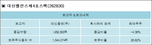대신밸런스제4호스팩(262830)은 27일 최대주주 대신증권(주)의 보유주식이 증가되었다고 발표했다. 이는 직전 보고일보다 252,500주 감소하여 지분율은 26.62%로 하락했다. 이번 보고 사유는 장내매매로 알려졌다.