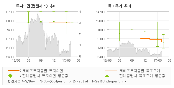 | 의견제시일자 | 증권사 | 투자의견 | 목표가 | | 20170427 | 케이프투자증권 | 매수(유지) | 83,600 | | 20170427 | 교보증권 | 매수(유지) | 76,000 | | 20170427 | 신한금융투자 | 매수(유지) | 80,000 | | 20170427 | BNK투자증권 | 매수(유지) | 80,000 |