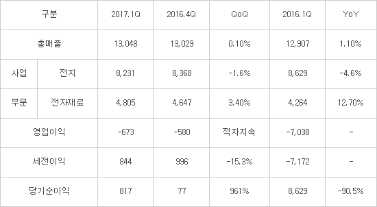 전지 사업부문은 자동차 전지 사업에서 유럽 고객 신규 모델 공급이 시작되면서 작년 동기와 작년 4분기 대비 판매가 확대됐다.