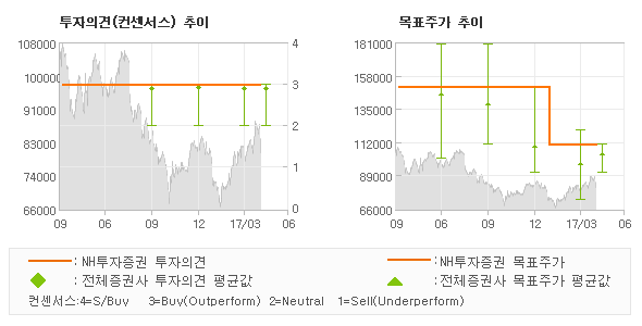 | 의견제시일자 | 증권사 | 투자의견 | 목표가 | | 20170427 | NH투자증권 | 매수(유지) | 110,000 | | 20170427 | 하이투자증권 | 매수(유지) | 110,000 | | 20170427 | 동부증권 | 매수(유지) | 97,000 | | 20170427 | 신한금융투자 | 매수(유지) | 110,000 |
