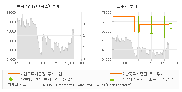 | 의견제시일자 | 증권사 | 투자의견 | 목표가 | | 20170427 | 대신증권 | 매수(신규) | 63,000 | | 20170427 | 한국투자증권 | 매수(유지) | 64,000 | | 20170427 | KTB투자증권 | 매수 | 60,000 | | 20170427 | 유진투자증권 | 매수(유지) | 59,000 |