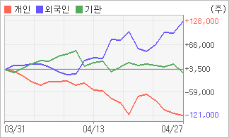 | 기관과 개인은 순매도, 외국인은 순매수(한달누적) 전일 외국인이 30,313주를 사들인 반면 기관은 23,649주를 팔았다. 4주간을 기준으로 보면 외국인이 초반에 동종목을 순매수한 이후에 기세를 이어가며 127,545주를 순매수한 반면, 기관은 순매수에서 순매도로 반전되면서 7,147주를 순매도했고, 개인들도 매도쪽으로 방향을 잡으면서 120,398주를 순매도한 것으로 집계됐다. |