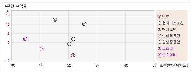 | 만도 | 삼성중공업 | 현대로템 | 현대미포조선 | 한화테크윈 | |