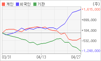 | 기관과 개인은 순매도, 외국인은 순매수(한달누적) 기관이 3일연속 주식을 팔고 있는 반면 외국인은 6일연속 주식을 사고 있다. 4주간을 기준으로 보면 외국인이 초반에 동종목을 순매수한 이후에 기세를 이어가며 1,614,510주를 순매수한 반면, 기관은 매도 관점으로 접근하면서 1,247,431주를 순매도했고, 개인들도 매도 우위로 반전되면서 367,079주를 순매도한 것으로 집계됐다. |