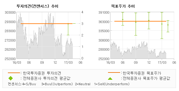 | 의견제시일자 | 증권사 | 투자의견 | 목표가 | | 20170428 | 한국투자증권 | 매수(유지) | 363,000 | | 20170428 | 미래에셋대우 | 매수(유지) | 340,000 | | 20170424 | HMC투자증권 | 매수 | 355,000 | | 20170412 | 하나금융투자 | 매수 | 360,000 |