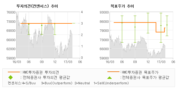| 의견제시일자 | 증권사 | 투자의견 | 목표가 | | 20170428 | HMC투자증권 | 매수 | 81,000 | | 20170428 | 대신증권 | 매수(유지) | 86,000 | | 20170428 | IBK투자증권 | 매수(유지) | 88,000 | | 20170428 | 한국투자증권 | 매수(유지) | 88,000 |