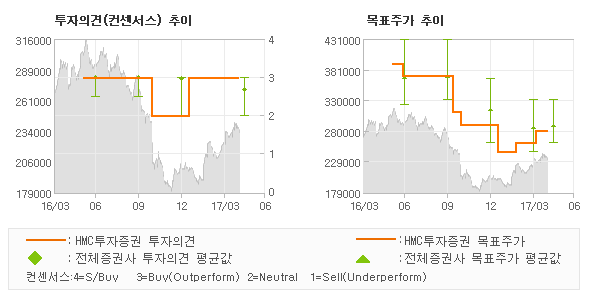 | 의견제시일자 | 증권사 | 투자의견 | 목표가 | | 20170428 | HMC투자증권 | 매수 | 280,000 | | 20170428 | 이베스트투자증권 | HOLD(유지) | 275,000 | | 20170428 | 미래에셋대우 | 매수(유지) | 275,000 | | 20170428 | KB증권 | HOLD(유지) | 280,000 |