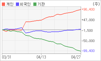 | 외국인/개인 순매수, 기관은 순매도(한달누적) 기관이 17일연속 주식을 팔고 있는 반면 외국인은 6일연속 주식을 사고 있다. 4주간을 기준으로 보면 외국인이 매매관점을 매도에서 매수로 전환하면서 3,084주를 순매수했고, 개인들도 순매수량을 늘리며 96,310주를 순매수했다. 하지만 기관은 매도 관점으로 접근하면서 99,394주를 순매도했다. |