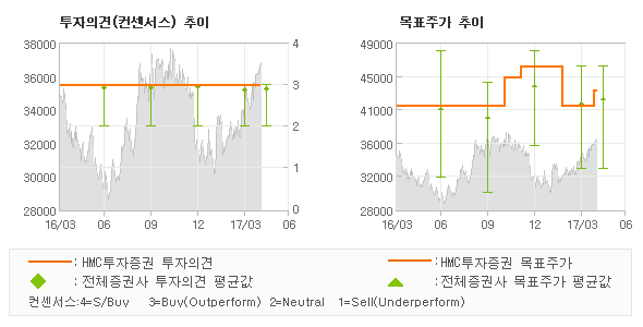 | 의견제시일자 | 증권사 | 투자의견 | 목표가 | | 20170428 | HMC투자증권 | 매수 | 43,000 | | 20170428 | 대신증권 | 매수(유지) | 45,000 | | 20170428 | IBK투자증권 | 매수(유지) | 46,000 | | 20170412 | 하나금융투자 | 매수 | 40,000 |