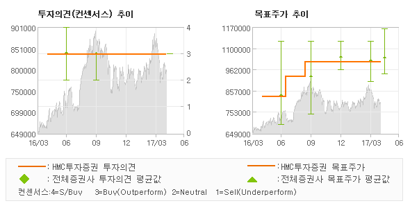 | 오늘 HMC투자증권에서 발표된 '매수'의견 및 목표주가 1,000,000원은 전체의견에 수렴하면서 시장의 평균적인 기대감이 비교적 객관적으로 표현된 것으로 풀이되며 목표가평균과 대비해서 미미한 차이가 나는 것으로 집계되었다. 참고로 최근에 목표주가를 가장 공격적으로 제시한 미래에셋대우에서 투자의견 '매수(유지)'에 목표주가 1,160,000원을 제일 보수적인 의견을 제시한 SK증권에서 투자의견 '매수(유지)'에 목표주가 910,000원을 제시한 바 있다. |