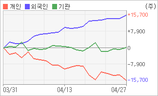 | 외국인/기관 순매수, 개인은 순매도(한달누적) 4월17일부터 외국인들이 9거래일 연속 순매수 행진을 벌이고 있다. 4주간을 기준으로 보면 외국인이 초반에 동종목을 순매수한 이후에 기세를 이어가며 15,621주를 순매수했고, 기관도 초반에 동종목을 순매수한 이후에 최근에는 순매수량이 줄어들고 있음에도 불구하고 32주를 순매수했다. 반면 개인들은 매도쪽으로 방향을 잡으면서 15,653주를 순매도한 것으로 나타났다. |
