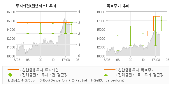 | 의견제시일자 | 증권사 | 투자의견 | 목표가 | | 20170428 | 신한금융투자 | 매수(유지) | 18,000 | | 20170428 | HMC투자증권 | MARKETPERFORM | 15,000 | | 20170428 | 대신증권 | 시장수익률(하향) | 16,000 | | 20170428 | IBK투자증권 | 매수(유지) | 17,500 |