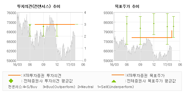 | 의견제시일자 | 증권사 | 투자의견 | 목표가 | | 20170428 | KTB투자증권 | 매수 | 80,000 | | 20170428 | HMC투자증권 | 매수 | 81,000 | | 20170428 | 대신증권 | 매수(유지) | 86,000 | | 20170428 | IBK투자증권 | 매수(유지) | 88,000 |