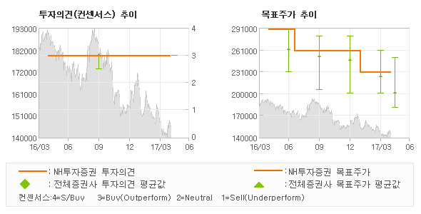 | 의견제시일자 | 증권사 | 투자의견 | 목표가 | | 20170428 | NH투자증권 | 매수(유지) | 230,000 | | 20170428 | 유진투자증권 | 매수(유지) | 180,000 | | 20170428 | 하나금융투자 | 매수 | 250,000 | | 20170428 | KTB투자증권 | 매수 | 180,000 |