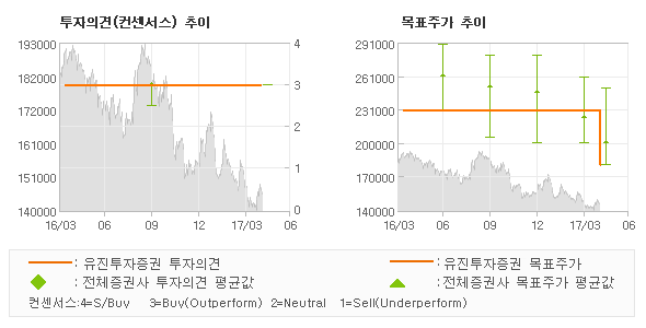| 의견제시일자 | 증권사 | 투자의견 | 목표가 | | 20170428 | NH투자증권 | 매수(유지) | 230,000 | | 20170428 | 유진투자증권 | 매수(유지) | 180,000 | | 20170428 | 하나금융투자 | 매수 | 250,000 | | 20170428 | KTB투자증권 | 매수 | 180,000 |