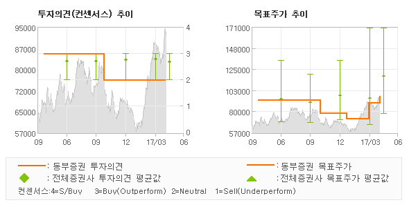 | 의견제시일자 | 증권사 | 투자의견 | 목표가 | | 20170428 | 동부증권 | HOLD(유지) | 96,000 | | 20170428 | 키움증권 | OUTPERFORM(MAINTAIN) | 110,000 | | 20170428 | 하이투자증권 | 매수(유지) | 110,000 | | 20170428 | NH투자증권 | HOLD(하향) | 110,000 |