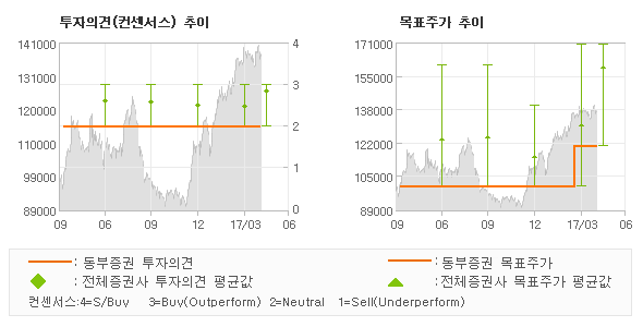 | 의견제시일자 | 증권사 | 투자의견 | 목표가 | | 20170428 | 동부증권 | HOLD(유지) | 120,000 | | 20170428 | 하이투자증권 | HOLD(MAINTAIN) | 133,000 | | 20170428 | NH투자증권 | 매수(유지) | 160,000 | | 20170428 | 하나금융투자 | 매수(상향) | 165,000 |